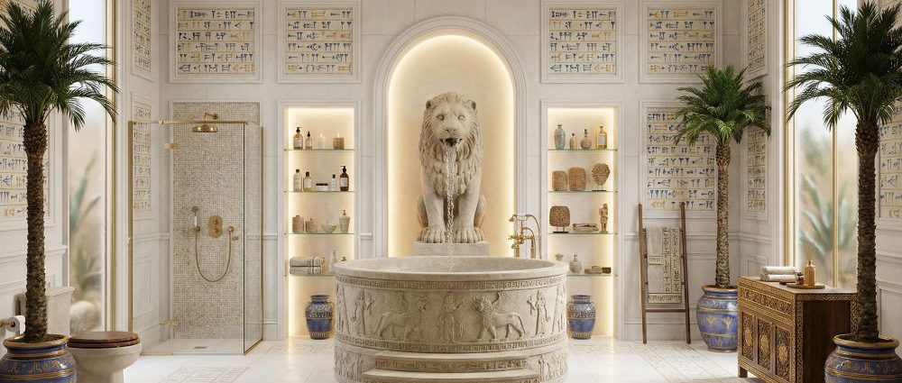 Beneath its dense symbolic language, the architectural skeleton of this bathroom is firmly Neo-Classical. The discipline of symmetry, proportion, and axial order acts as a stabilizing force, ensuring that the accumulation of ancient references never tips into visual excess. The room is organized along a clear central axis, radiating outward from the circular bathtub and lion fountain. This compositional strategy recalls the spatial logic of temples and ceremonial chambers, where order itself was a form of meaning.